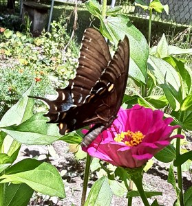 Here are some flowers with a bee and a couple of butterflies. There were at least half a dozen species on the zinnias while I watched. They’re so intent on nectar at this point, they just pose for me. I envy their ability to hang out socially as usual, oblivious to COVID.