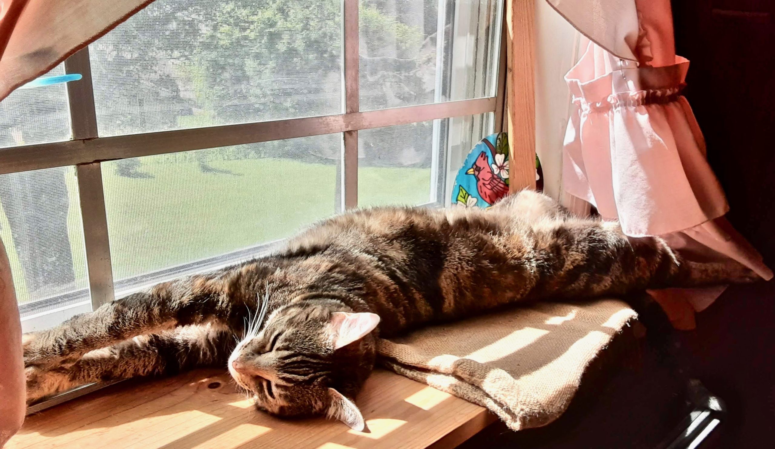 a Misu decadently lounging on her expanded orchid-less sill,
