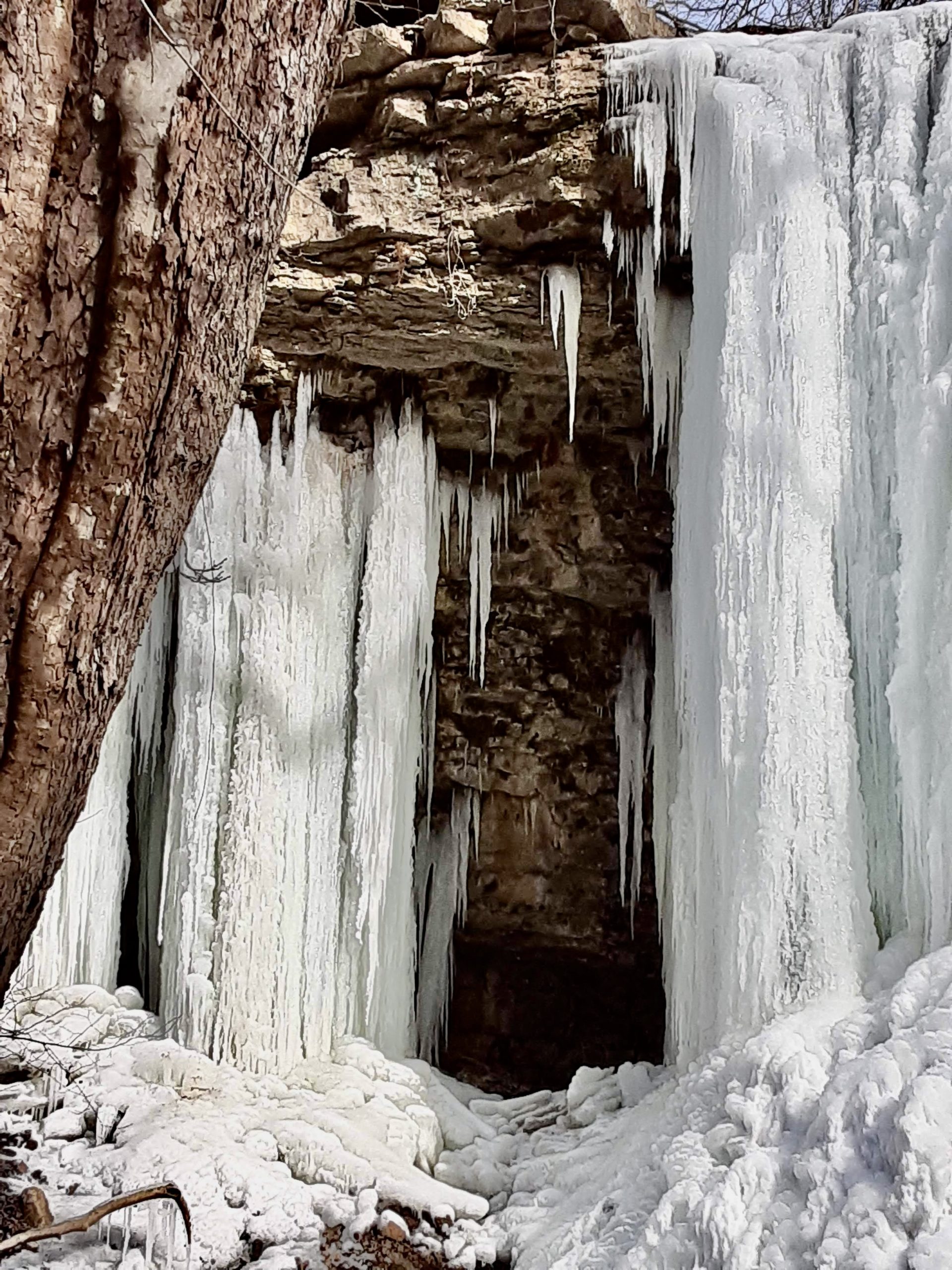 Glen Helen was closed due to ice, so we tried John Bryan. We crossed the beautiful rebuilt bridge, and all was going well, until we hit the iceskating rink! The whole path was like a frozen stream, but starting to melt in the 60º temps, so doubly treacherous. We made a brave effort to reach the second bridge, but could barely stay upright, so we had to turn around and slide all the way back!