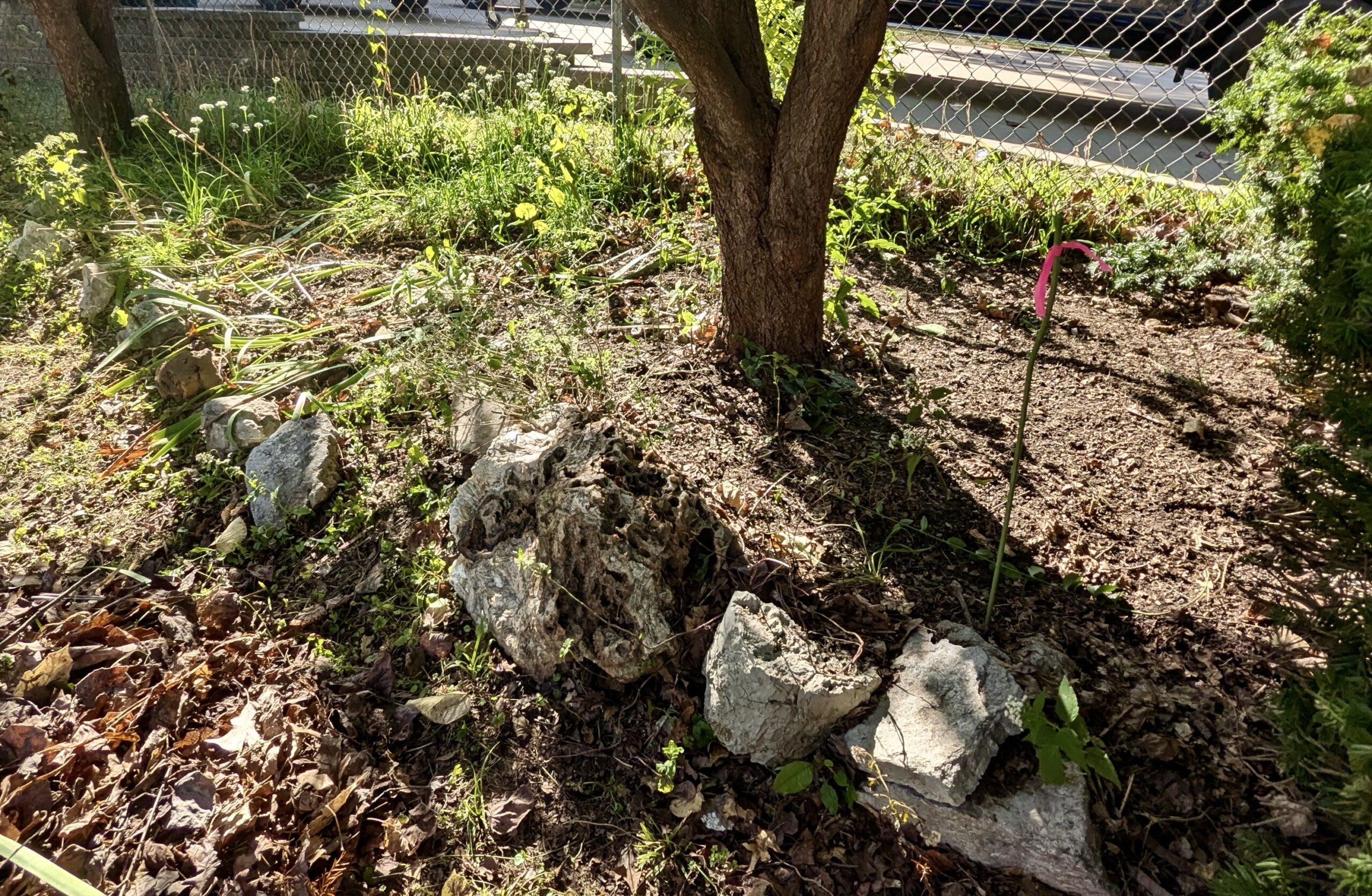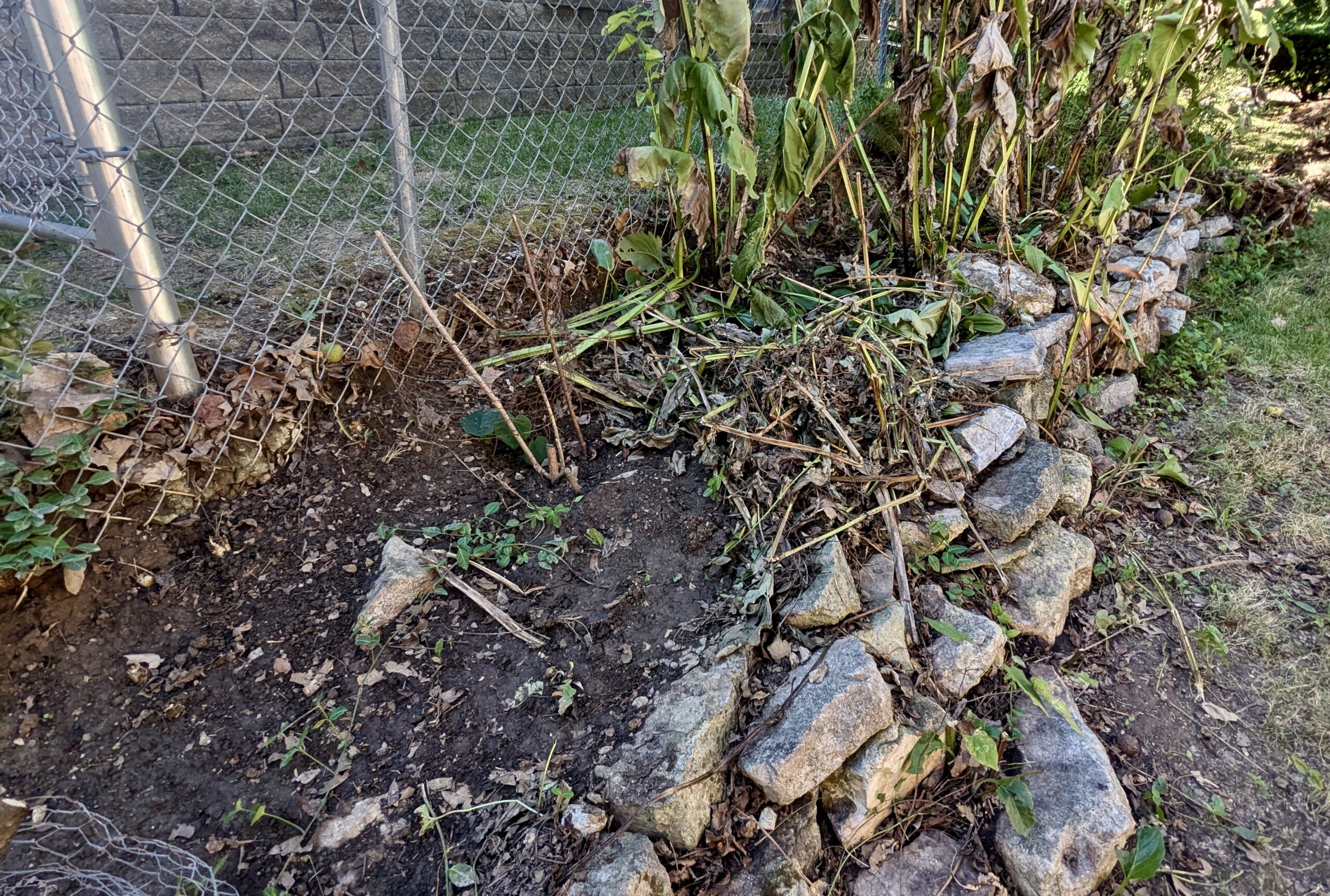 Yesterday I raked out the whole front length of neglected rock garden along the fence, except for the remaining silphium (cup plant) stalks that haven’t keeled over yet. I’m trying to keep a balance between leaving things alone for critters to overwinter in, and prepping the area for native flower seeds that I’m going to introduce to stratify over winter. Once everything is seeded, I can go ahead and let leaves naturally mulch all the beds.