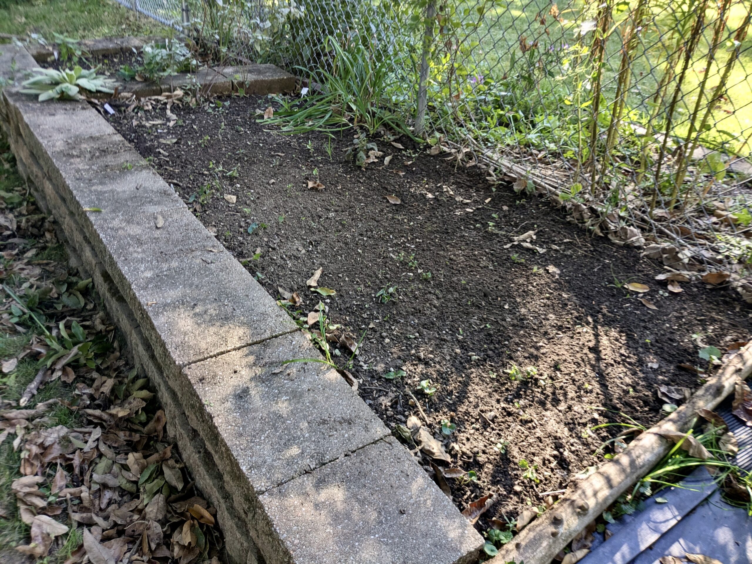 I also raked out the two raised beds in the back along the same fence. I’m not sure yet what to use them for this time around, since the pumpkins, melons, etc. didn’t work out there. For now I’ll just mulch them with leaves and wood chips to break down over winter. (Just thinking out loud here; my strategies change every five minutes. It’s the middle of the night, and playing garden chess in my mind is what I do for fun.)