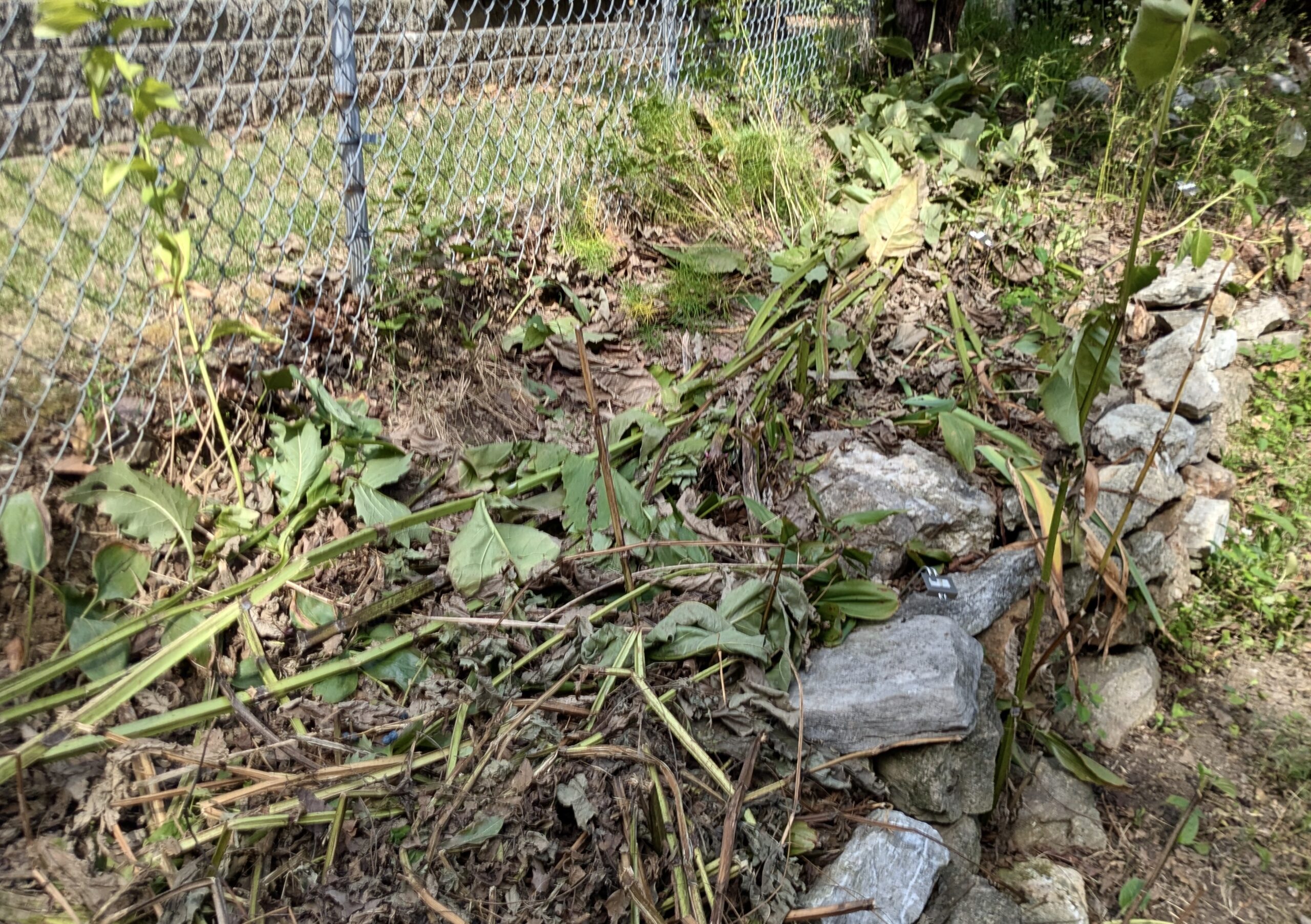 I’ve included photos of the garden work I did yesterday (the silphium stalks came down after all), plus the neighbor kitty relaxing in the front garden.